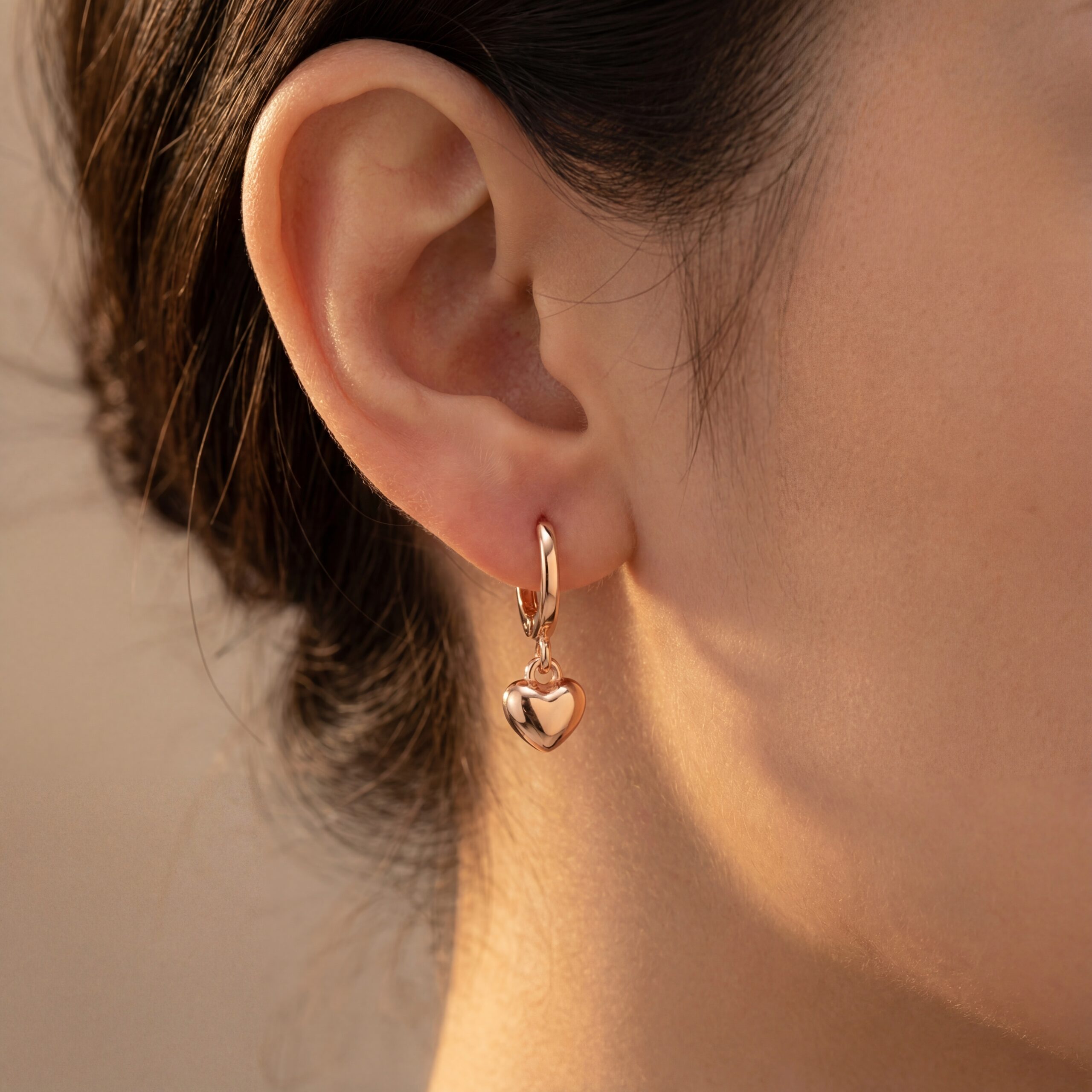 Elegantes aretes Huggie bañados en Oro 18k, con un dije de corazón abombado y brillante. Hipoalergénicos e impermeables, este par es el regalo perfecto para aniversarios, cumpleaños y San Valentín, con un acabado de lujo.