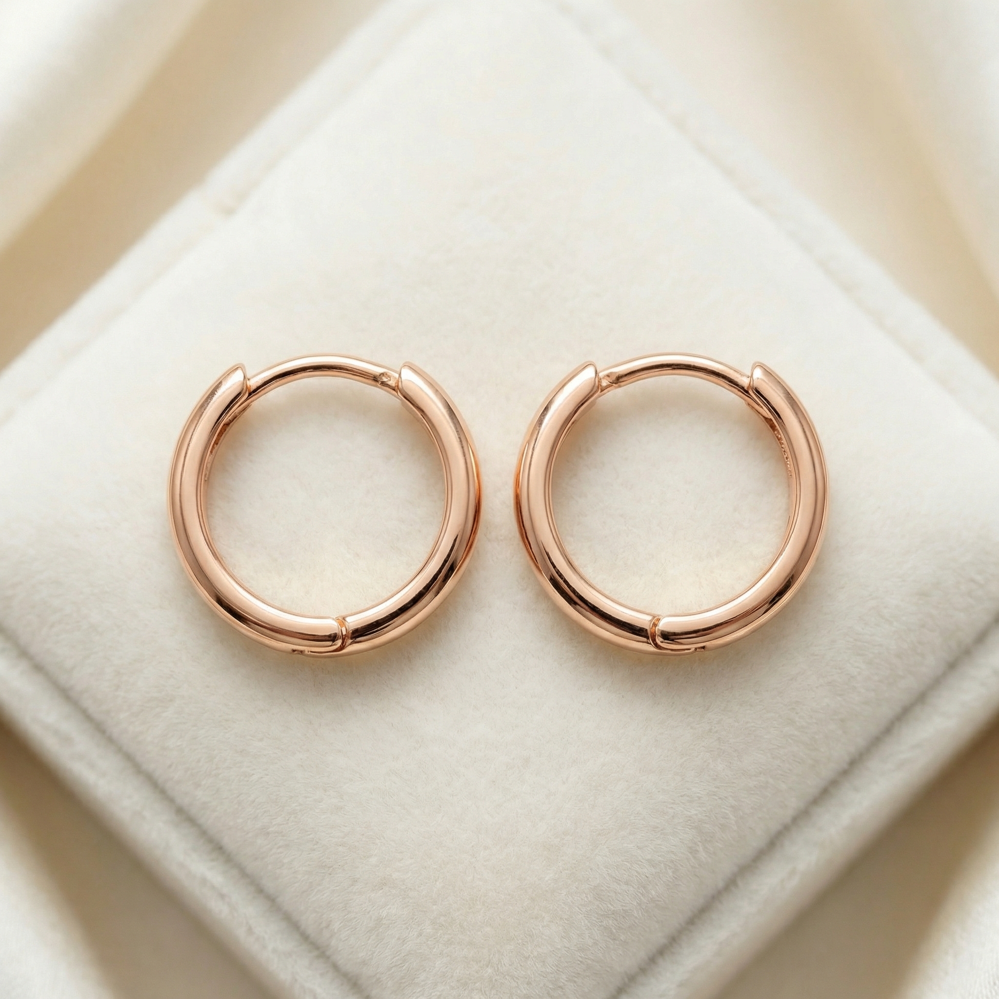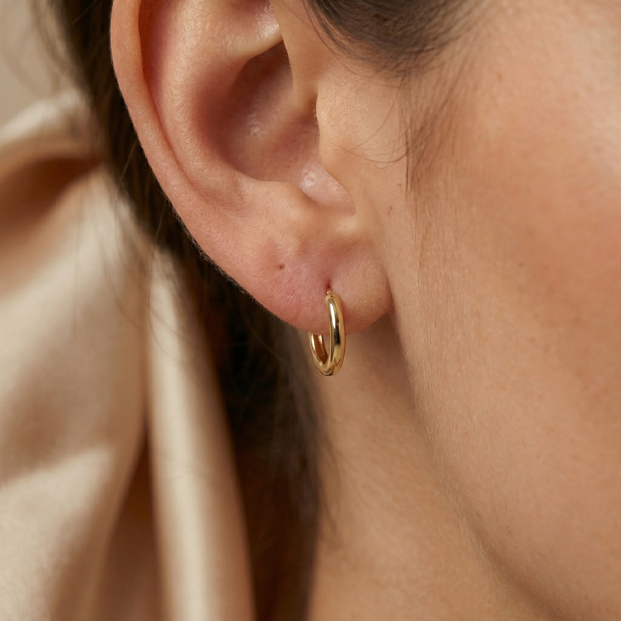 Elegantes aretes argolla lisos estilo huggie, bañados en Oro 18k, con un diseño minimalista y acabado de lujo. Hipoalergénicos e impermeables, ideales para Aniversarios, Cumpleaños y San Valentín.