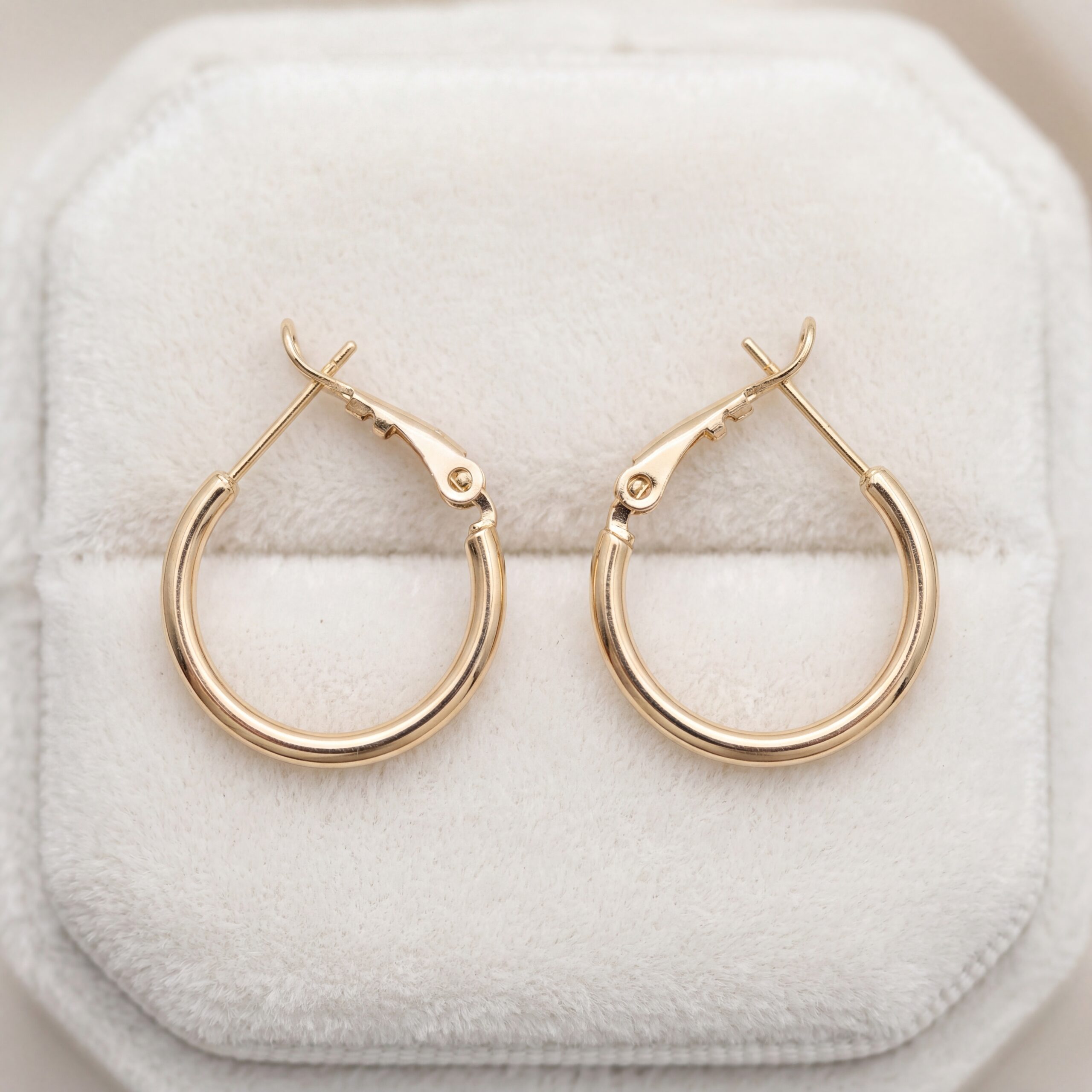Aretes de argollas pequeñas, diseño circular liso y pulido en Oro 18k. Un básico de lujo, hipoalergénico e impermeable. Ideales para Aniversarios, Cumpleaños y San Valentín.