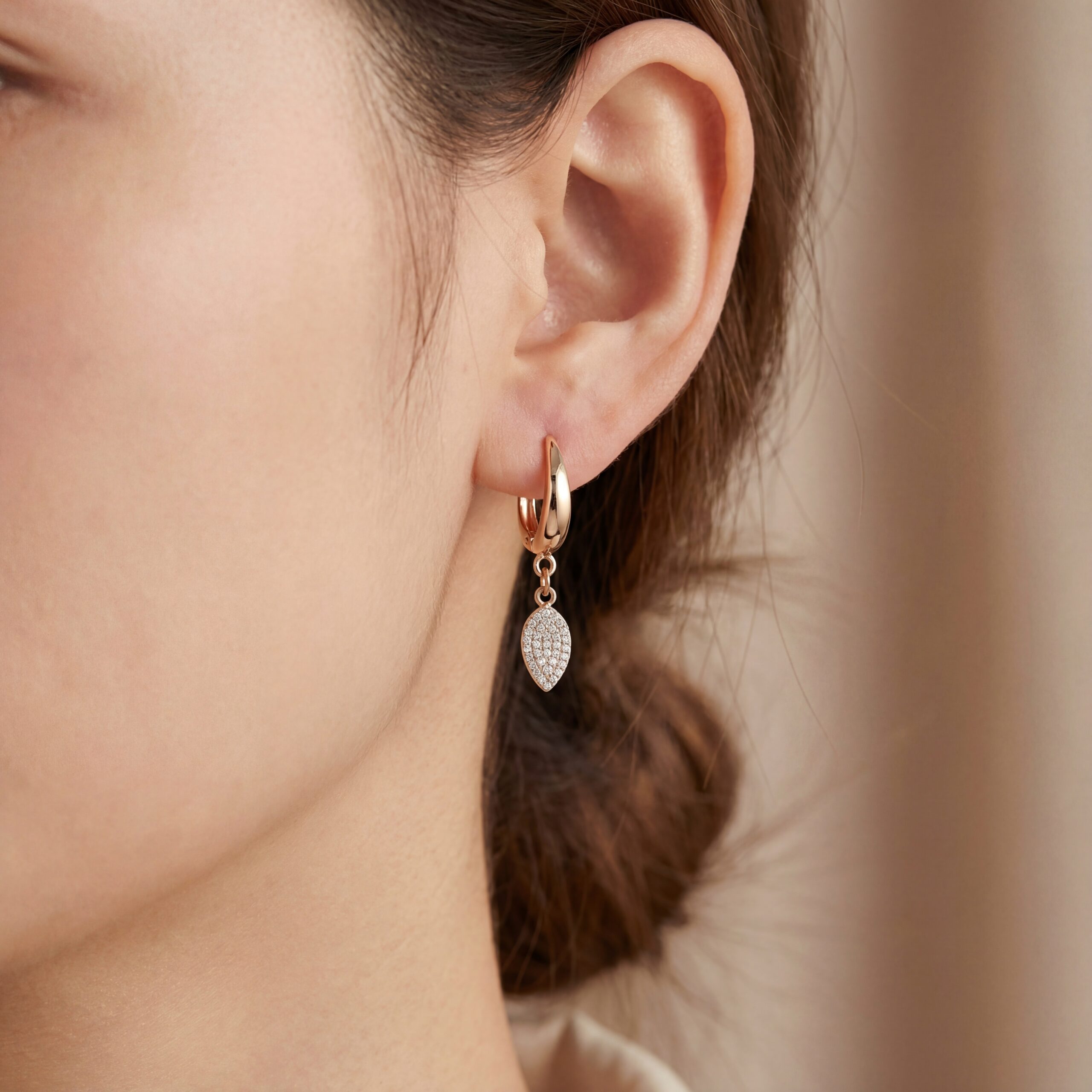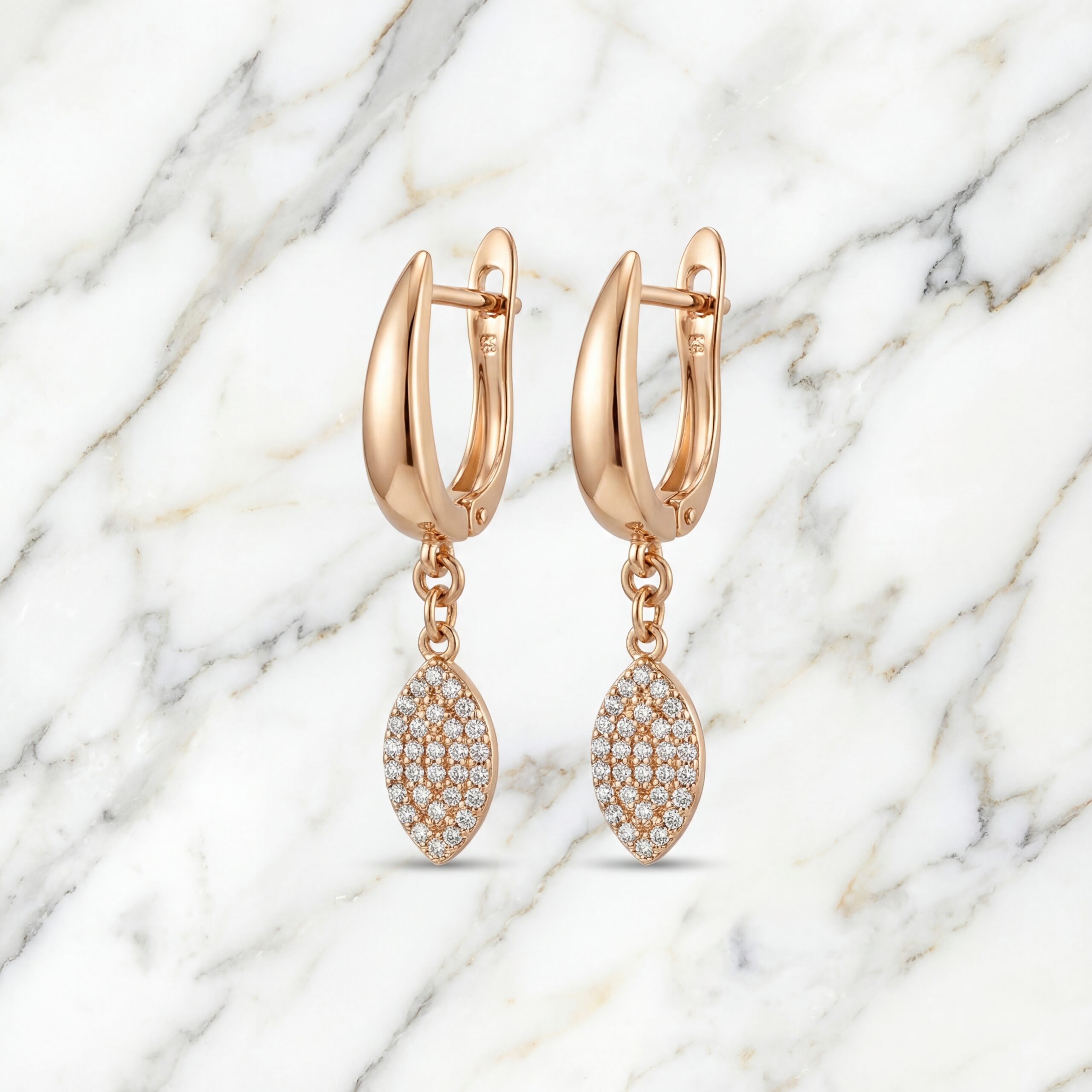 Sofisticados aretes bañados en Oro 18k, con un dije ovalado engastado en pavé de zirconias. Acabado de lujo hipoalergénico, perfectos para Aniversarios, Cumpleaños y San Valentín.