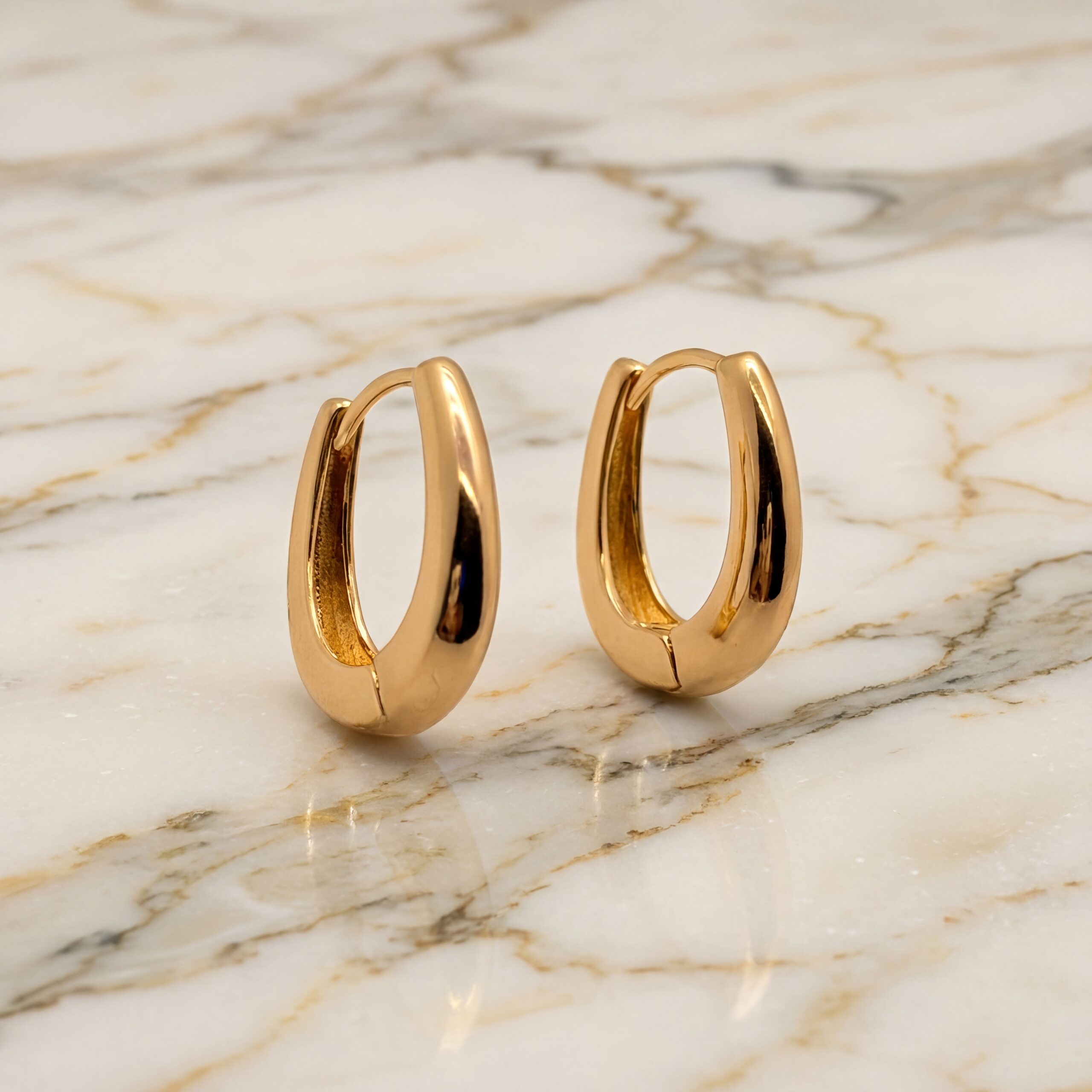 Realza tu estilo con aretes argollas huggie ovaladas alargadas, diseño voluminoso y liso bañado en Oro 18k. Hipoalergénicas, impermeables y con acabado de lujo, son perfectas para aniversarios, cumpleaños y San Valentín.