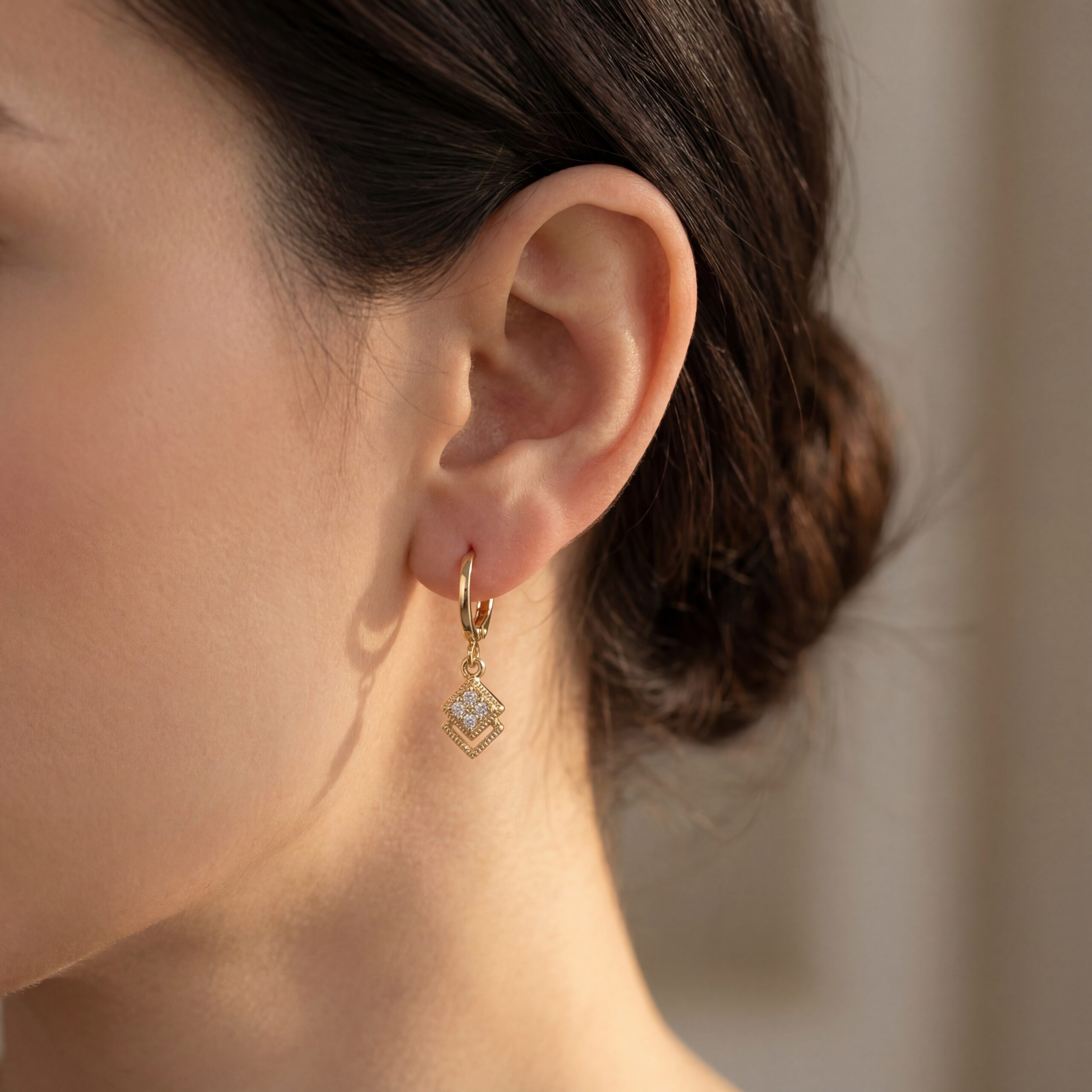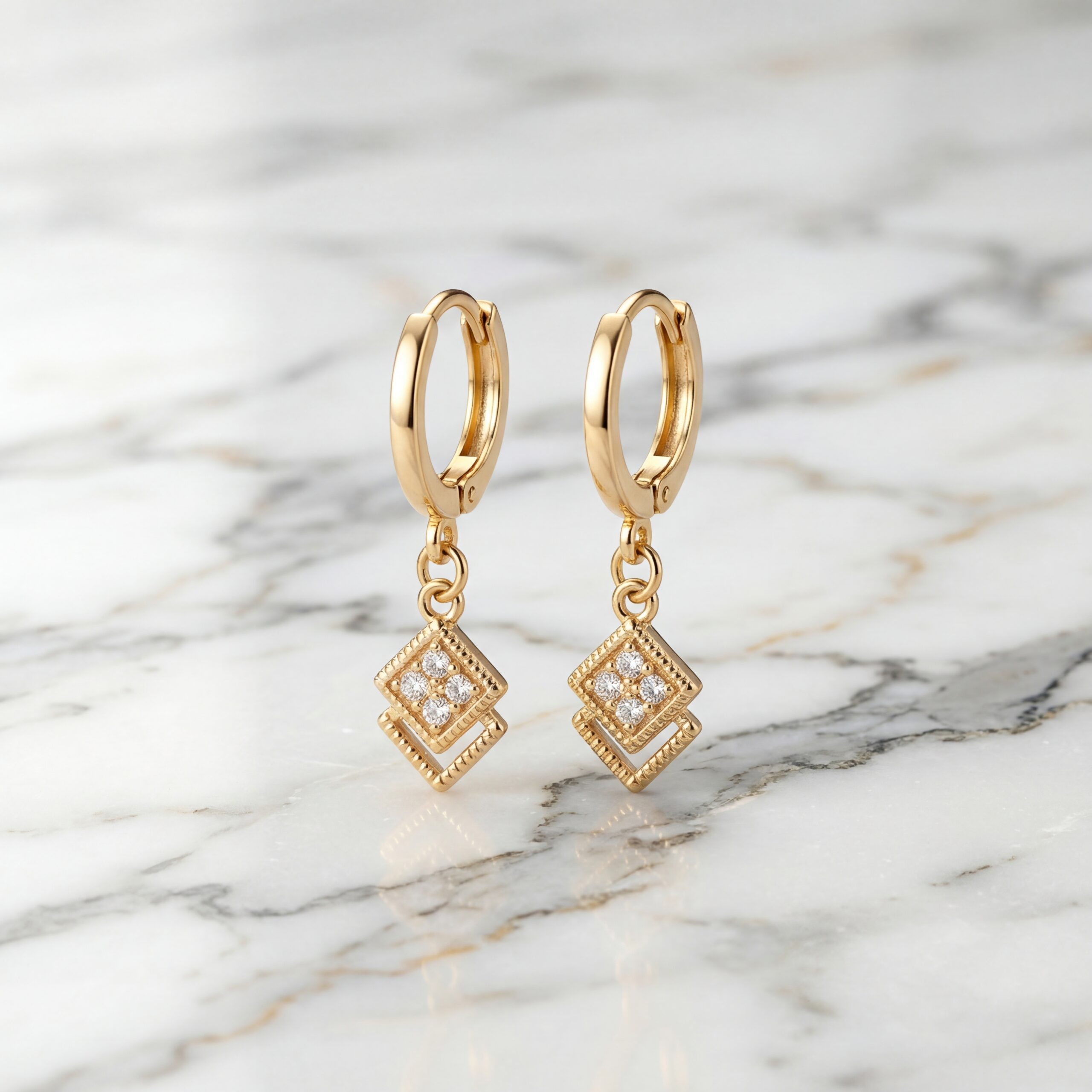 Par de Aretes Argollas Huggie con Dije Rombos Conectados y Zirconias Bañado en Oro 18k Hipoalergénicas e Impermeables – D’moé Joyería
