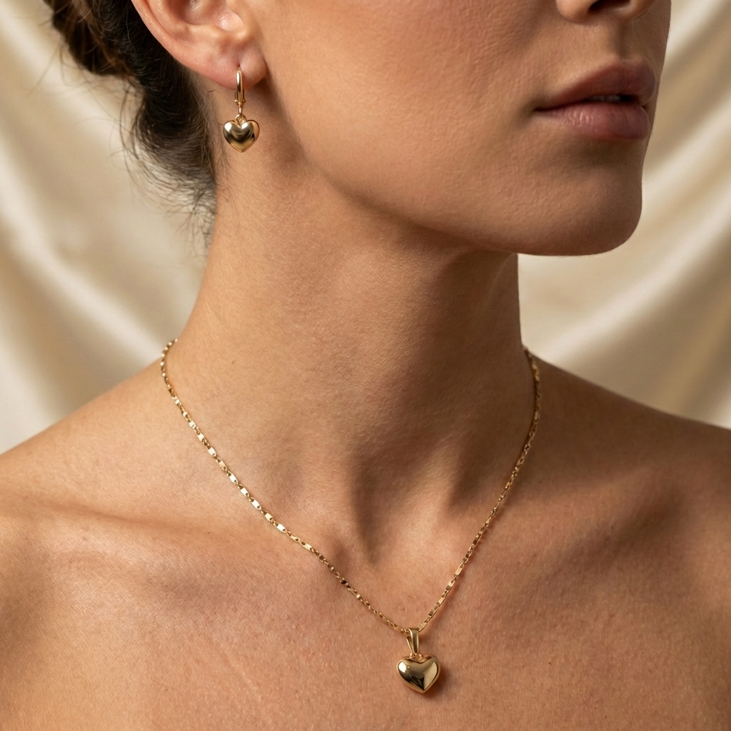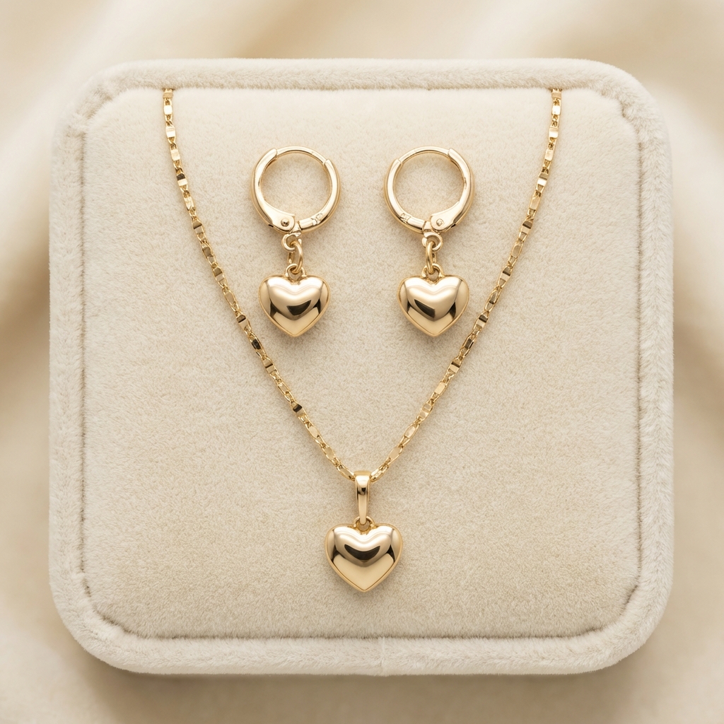 Set de Aretes, Dije y Collar Corazones Abombados Lisos Pulidos Bañado en Oro 18k Hipoalergénicas e Impermeables – D’moé Joyería