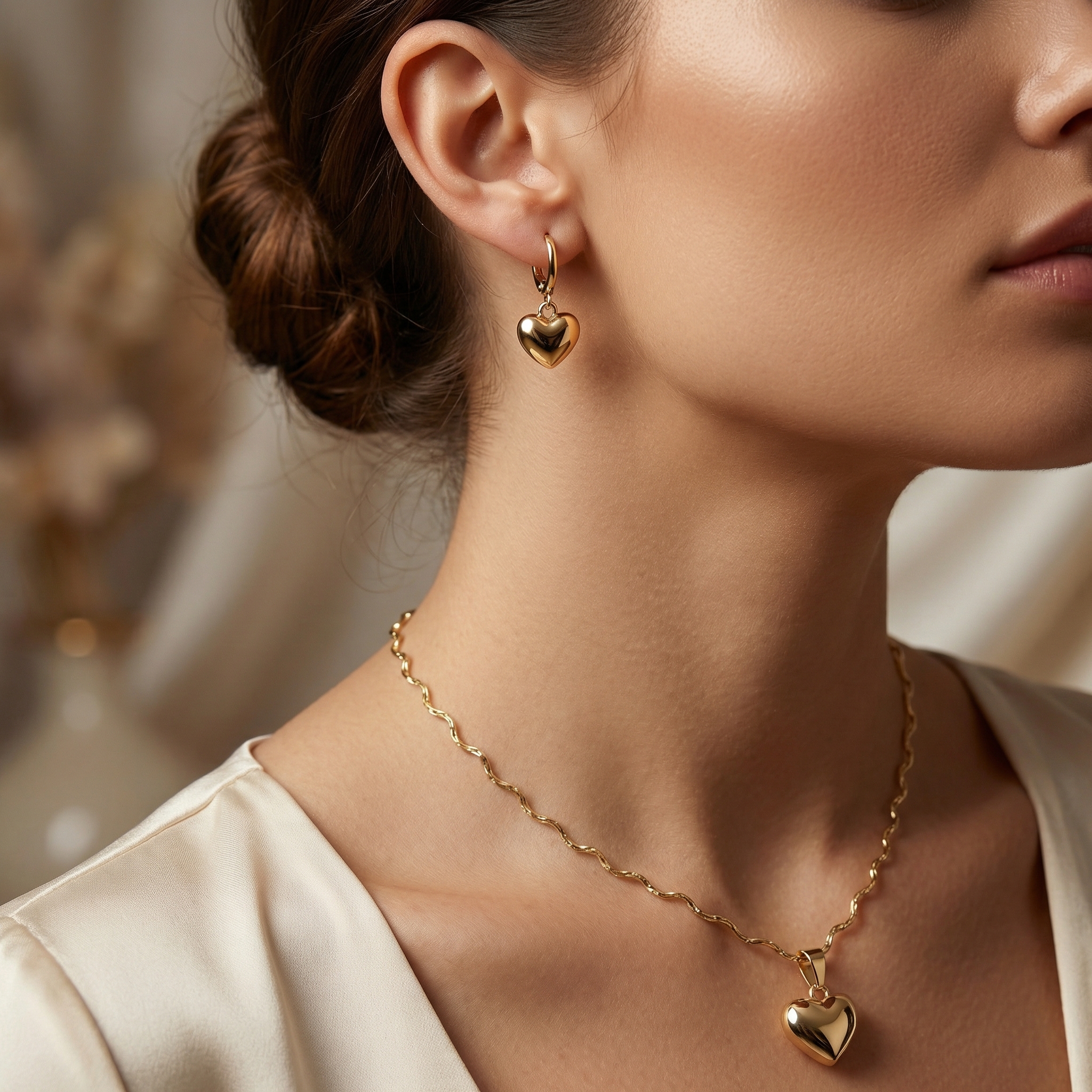 Set de Aretes, Dije y Collar Corazones Abombados Lisos con Cadena Ondulada Bañado en Oro 18k Hipoalergénicas e Impermeables – D’moé Joyería
