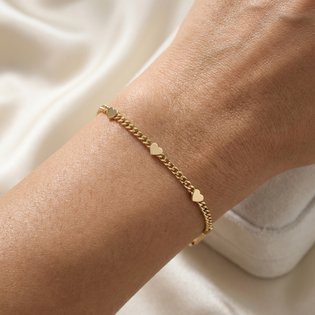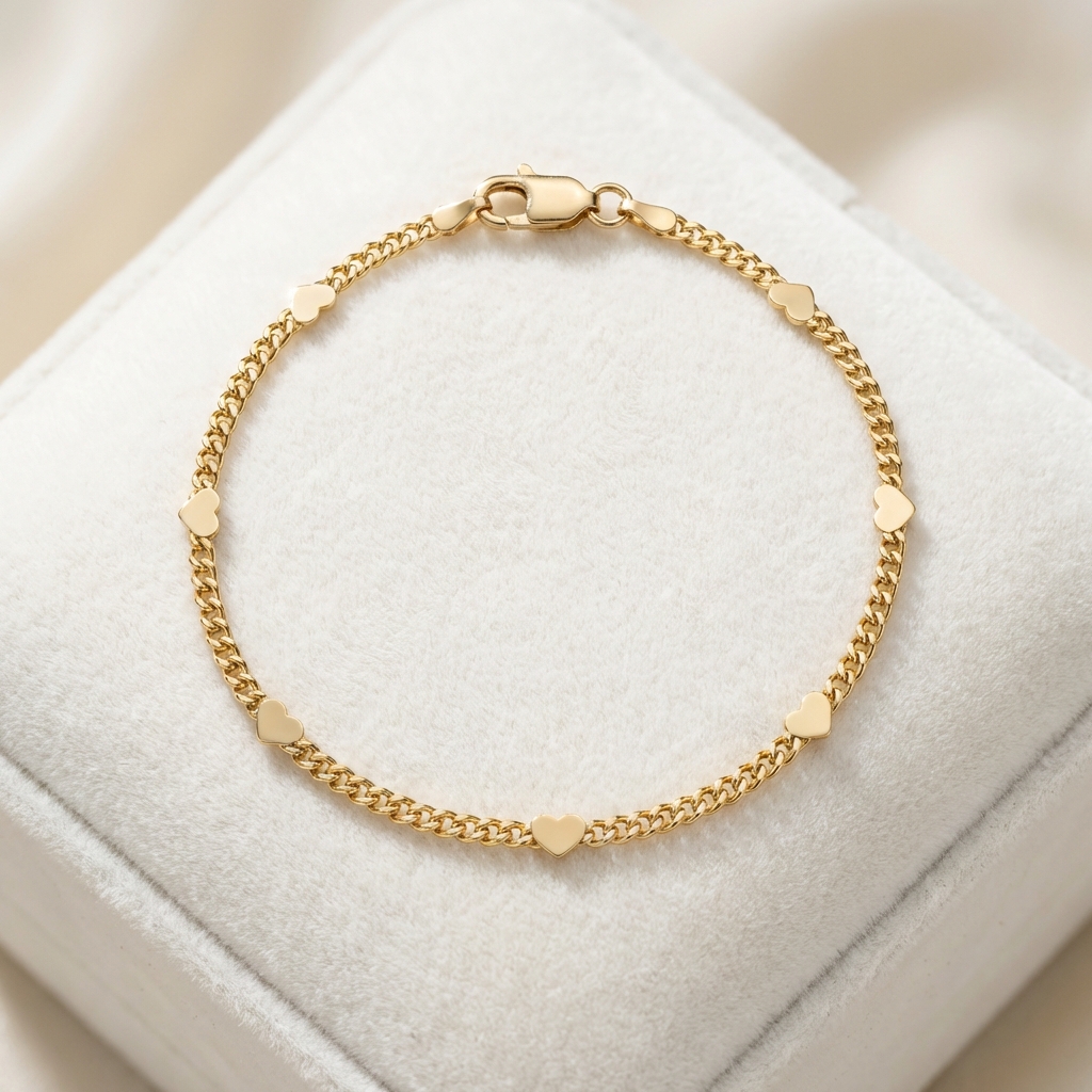Descubre esta pulsera bañada en oro 18k con delicados eslabones planos y corazones lisos intercalados. Un diseño romántico de acabado de lujo, hipoalergénica e impermeable. Perfecta para Aniversarios, Cumpleaños y San Valentín.