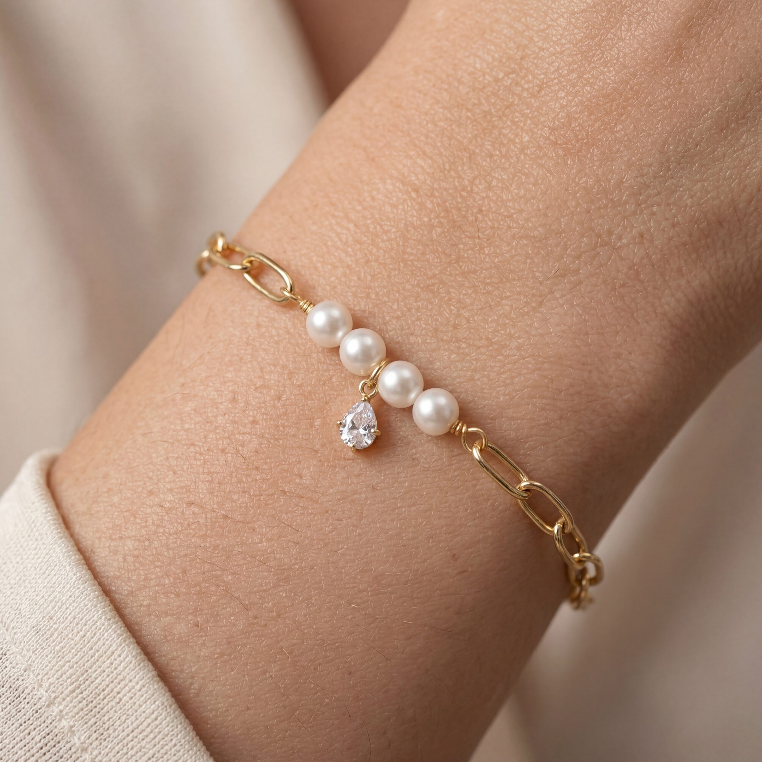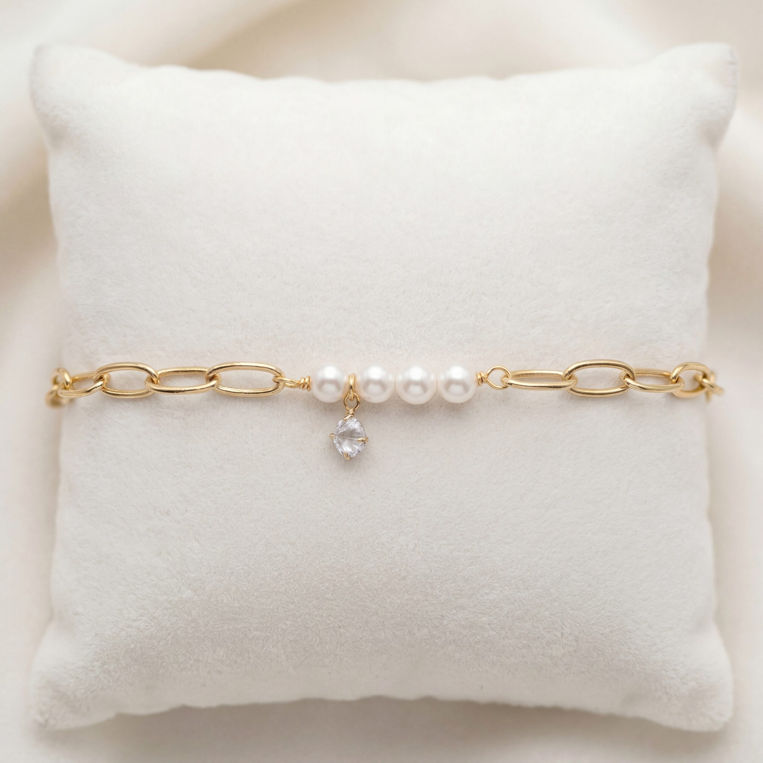 Pulsera de eslabones ovalados bañada en Oro 18k, con cuatro perlas y un dije de zirconia gota. Un acabado de lujo, hipoalergénico, perfecto para aniversarios, cumpleaños y San Valentín.