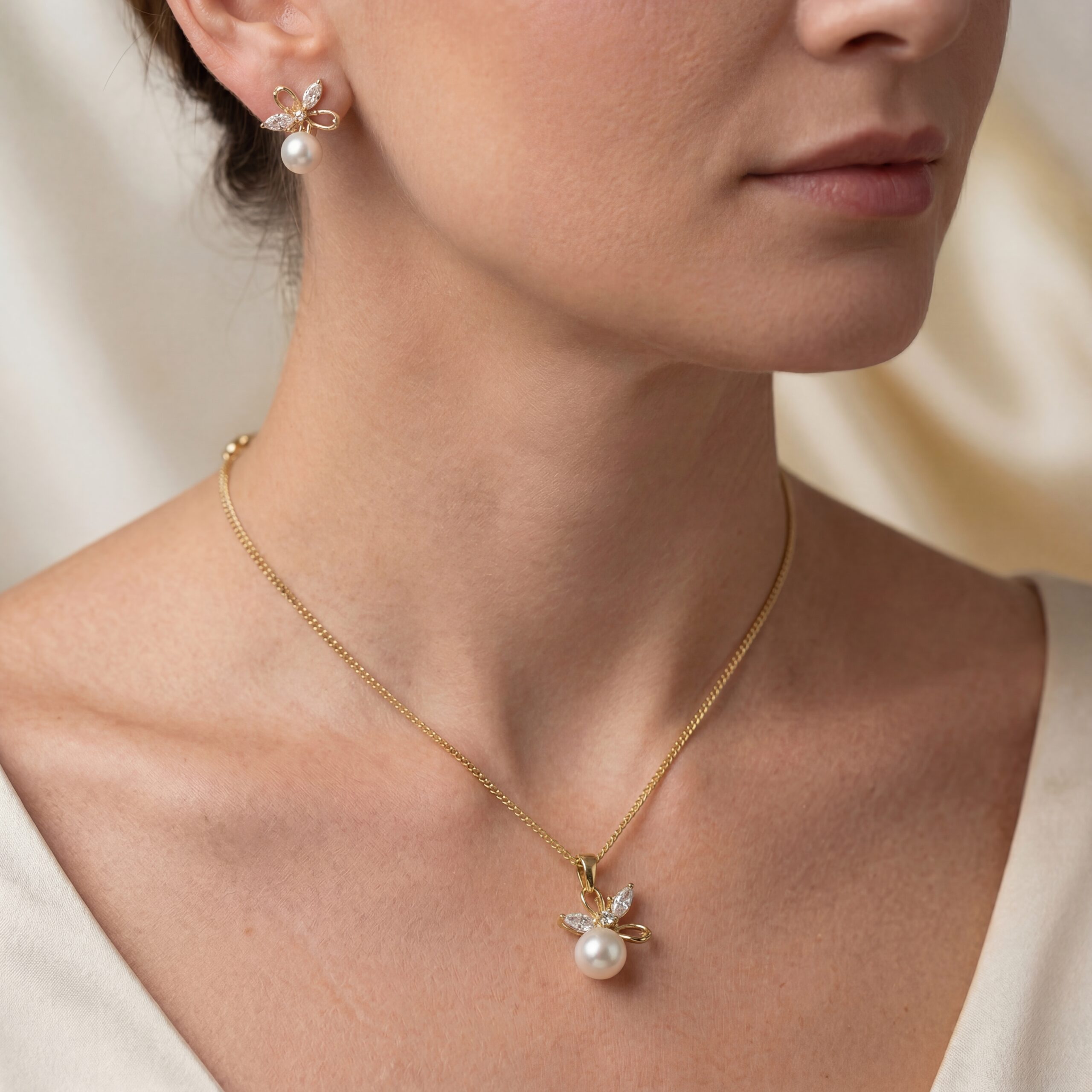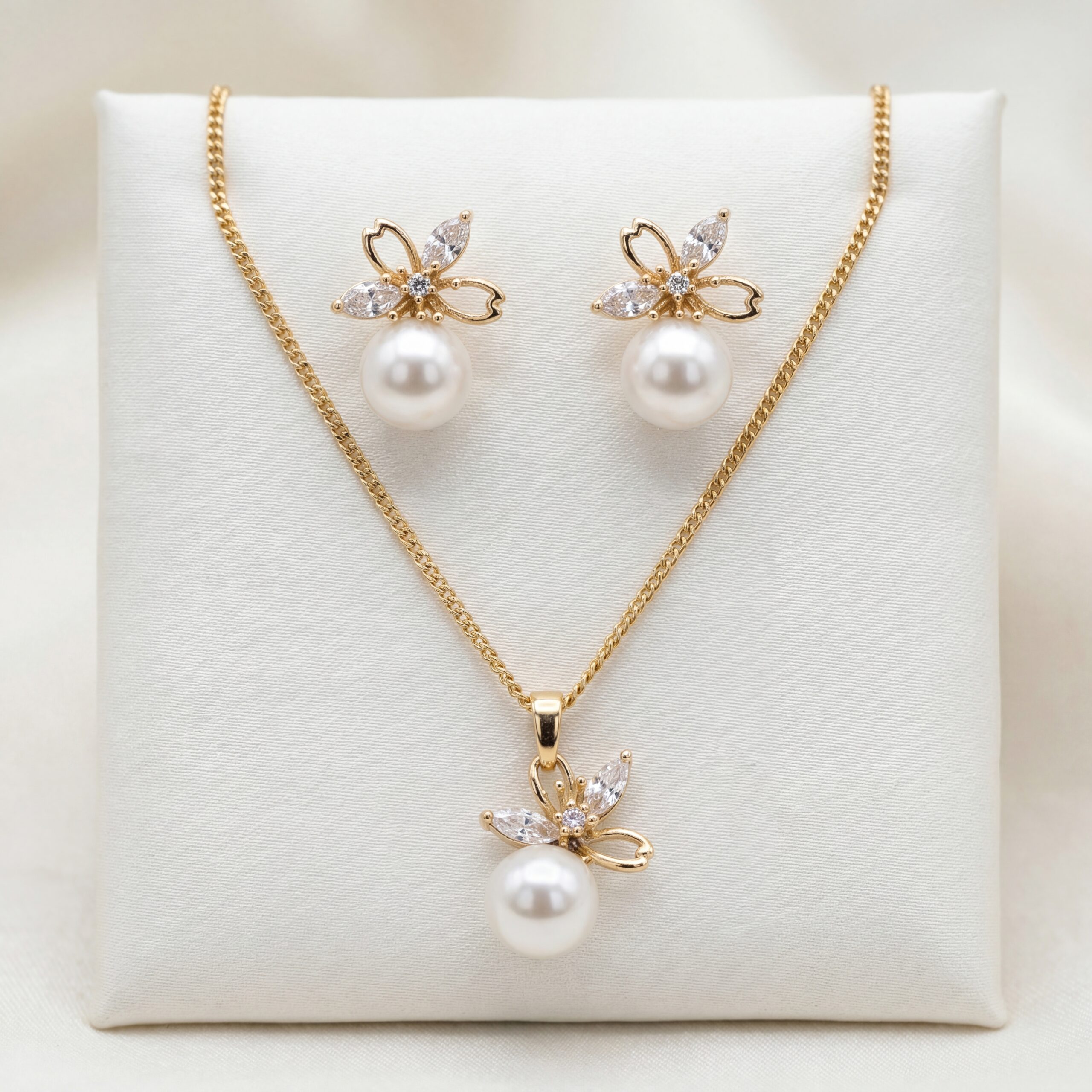 Set de Aretes, Dije y Collar Diseño floral con perla y zirconias marquesa Bañado en Oro 18k Hipoalergénicas e Impermeables – D’moé Joyería