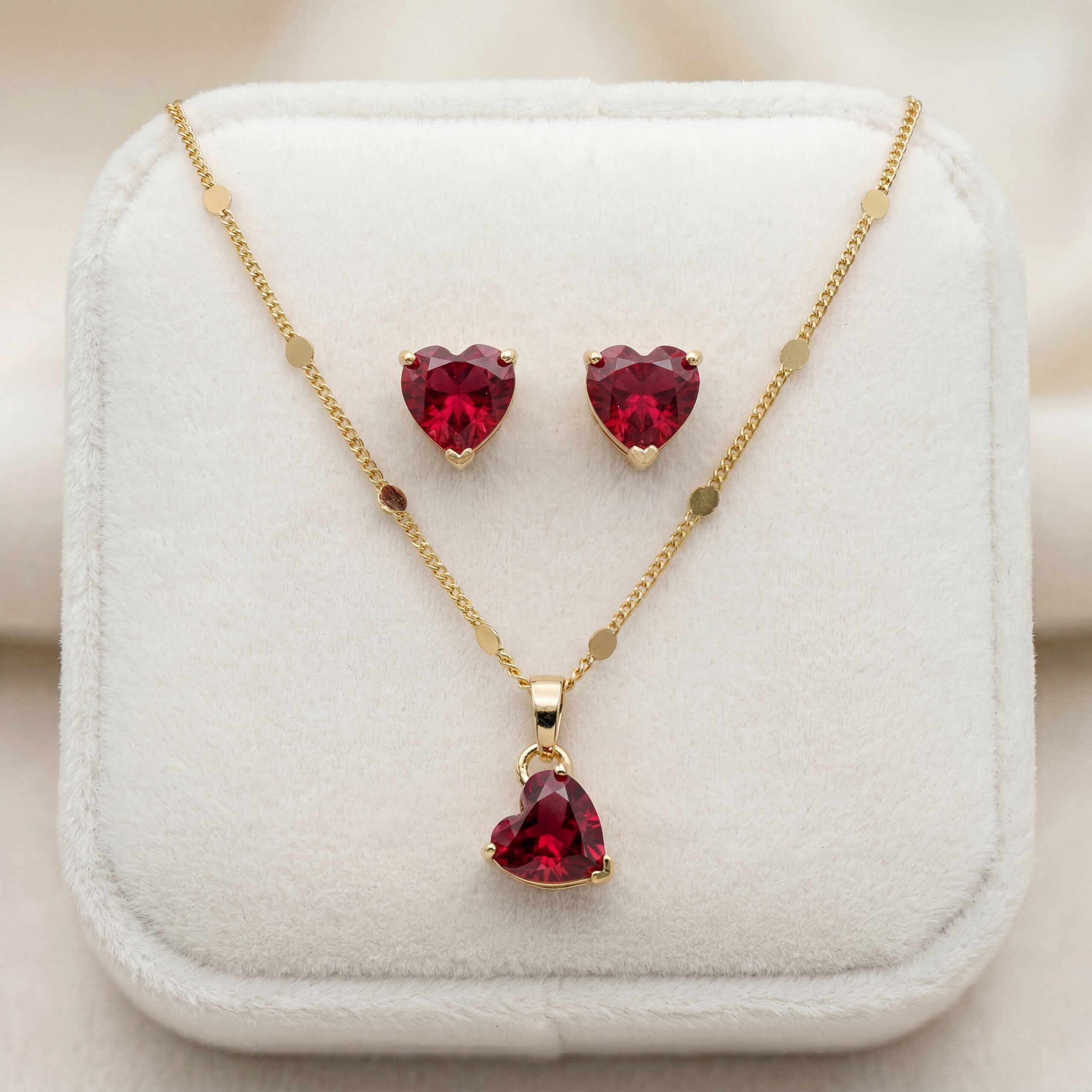 Este elegante set incluye aretes, dije y collar con corazones de zirconias rojas facetadas, bañados en Oro 18k. La cadena con discos pulidos realza su acabado de lujo. Hipoalergénico, es perfecto para Aniversarios, Cumpleaños y San Valentín.