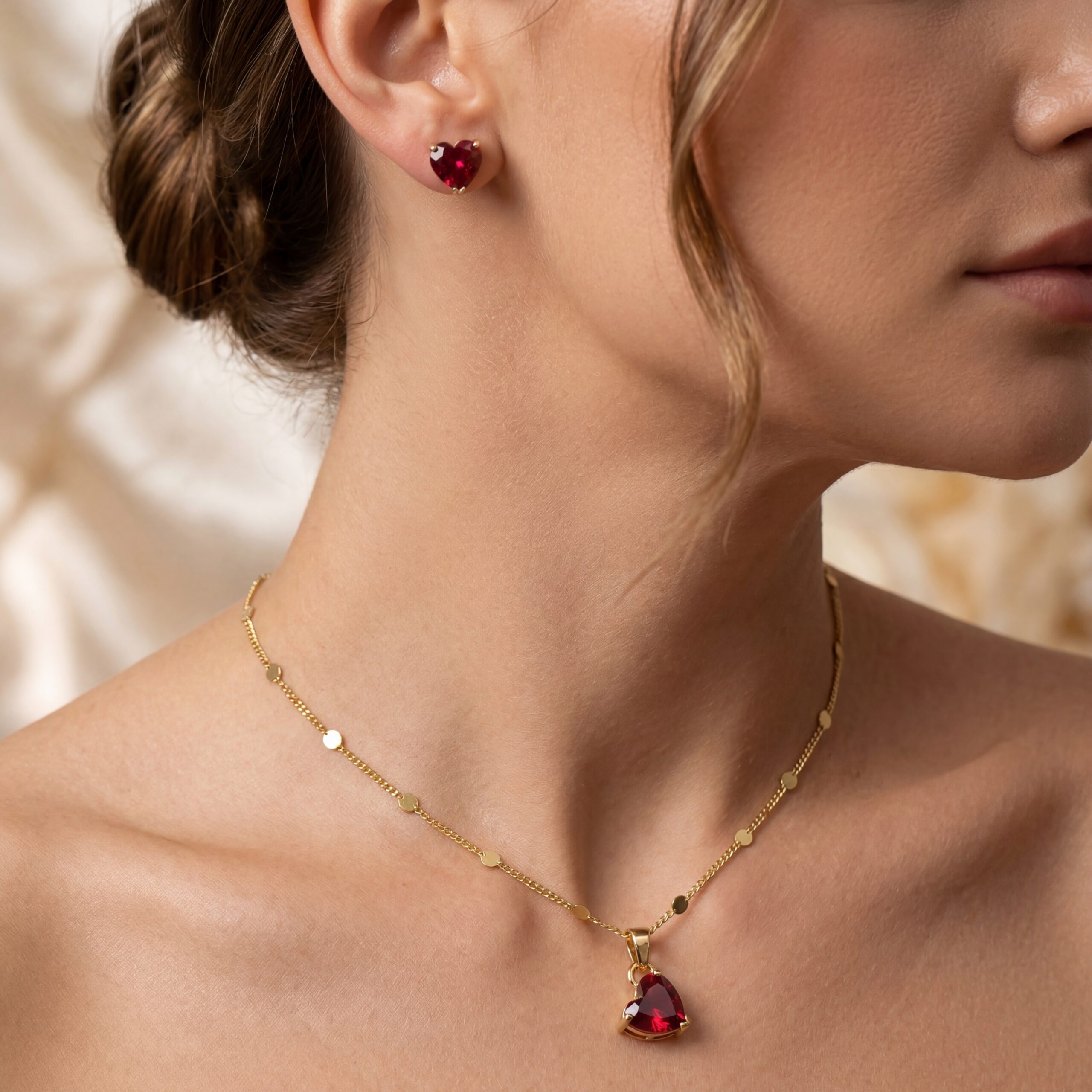 Set de Aretes, Dije y Collar Corazones Rojos Brillantes con Cadena de Discos Bañado en Oro 18k Hipoalergénicas e Impermeables – D’moé Joyería